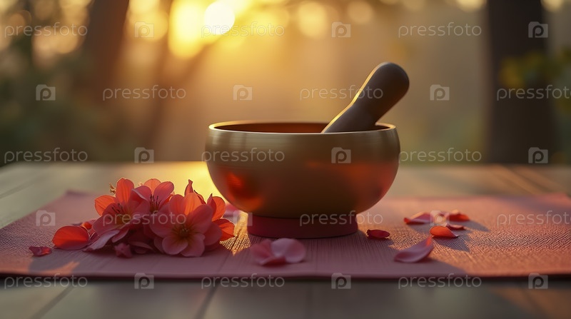 Пустой ковер для йоги рядом с бронзовой певчей миской, AI generated image