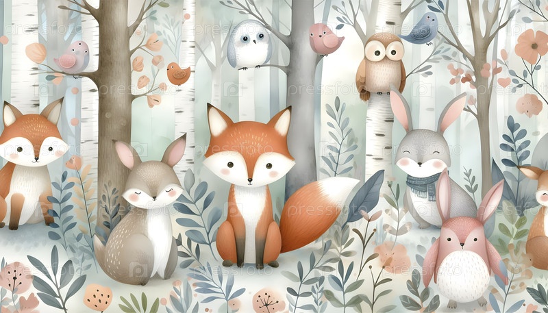 Причудливая акварель леса детская комната обои с дружелюбными животными - лисы, кролики и совы, Ai created image