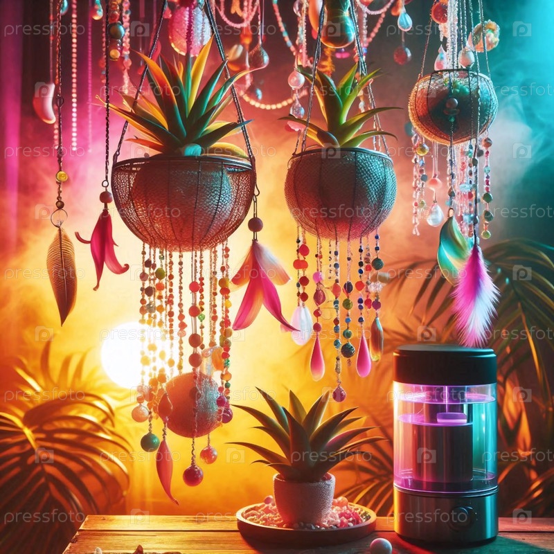 Интерьер в стиле бохо, стеклянные террариумы с воздушными растениями Tillandsia и увлажнителем, Ai generated image