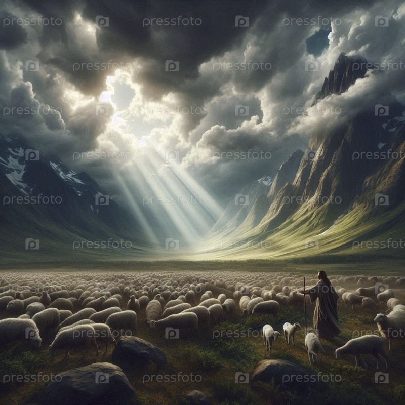 Пастух, передвигающийся со своим большим стадом через высокий горный перевал с размытыми штормовыми облаками и солнечными лучами, создающими божественный свет