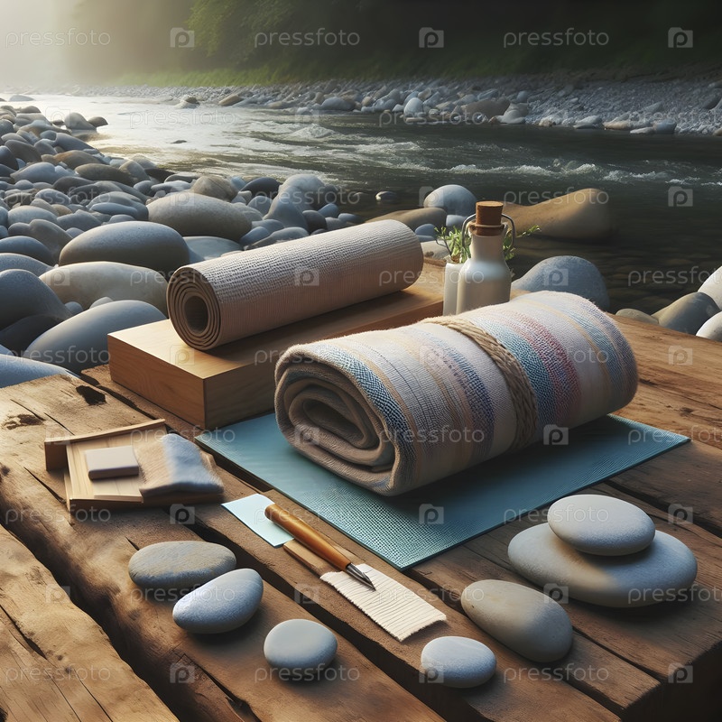 Тщательно расположенные реквизиты йоги на берегу реки - ковер, блоки, прокаленное одеяло, Ai created image