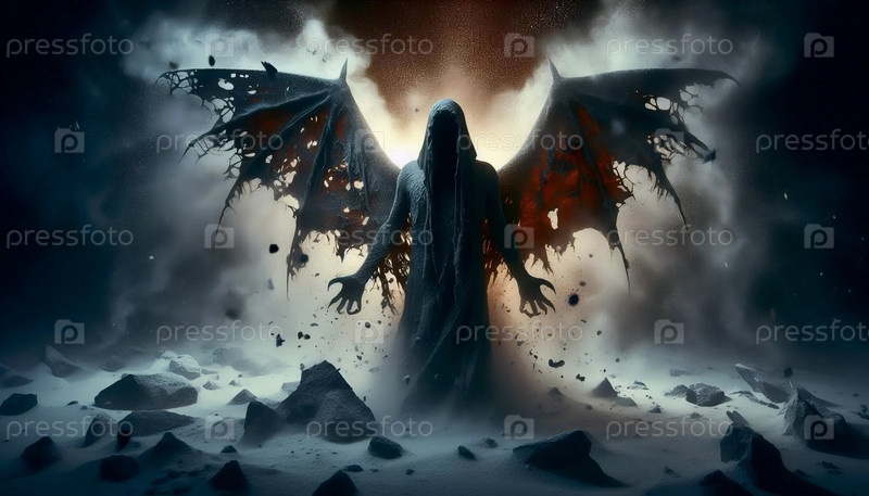 Скелетный ангел с крыльями, съеденными молью в заброшенной церкви, Ai generated image