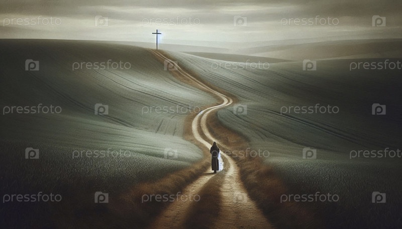 Человек, идущий в сторону по тропинке к далекому кресту на вершине холма, Ai generated image