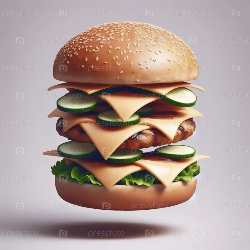 Пищевое искусство оптической иллюзии, показывающее невозможную структуру бургера с плавающими элементами, Ai created image