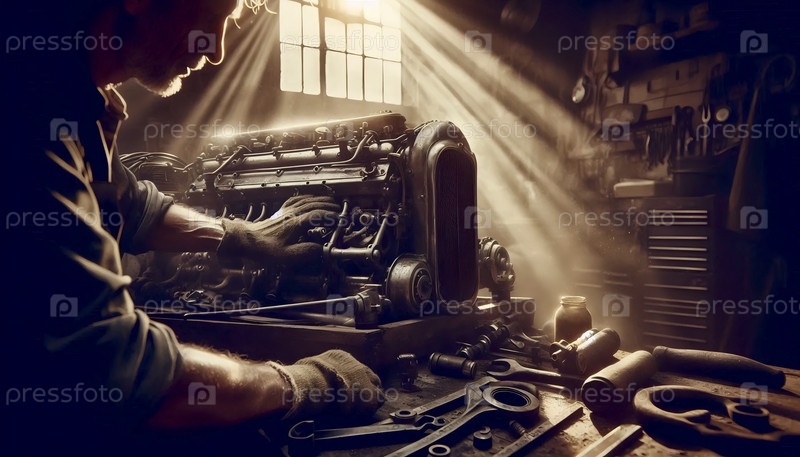 Механик, работающий под поднятым капотом классического автомобиля в пыльном солнечном гараже с разбросанными инструментами и лучами света, прорезающими воздух, создал изображение Ай