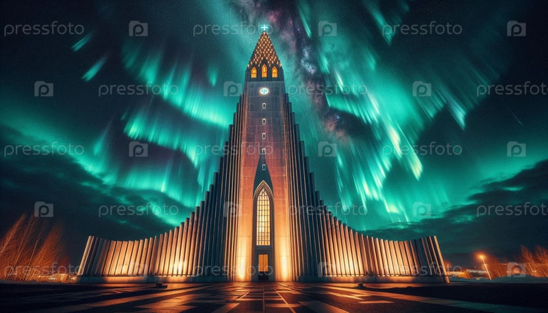 Northern Lights over Hallgrimskirkja, Ai generated image Северное сияние над Халлгримскиркью, Ай создано изображение