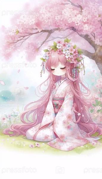 Кавайская сцена девушки, цветущей в вишневом цвете весной, Ai generated image