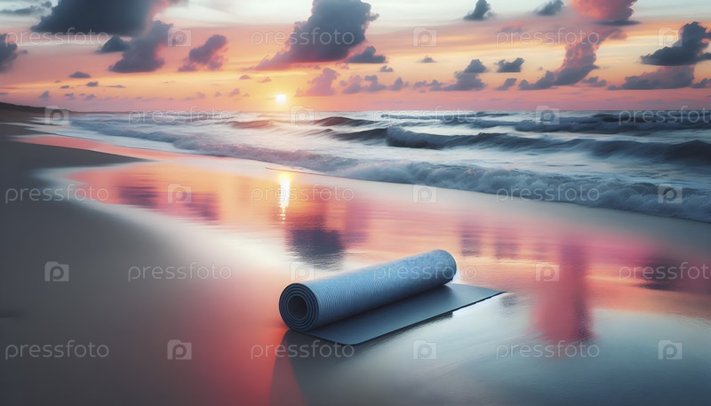 Одинокий йога-мат на белом песчаном пляже при закате, Ai created image