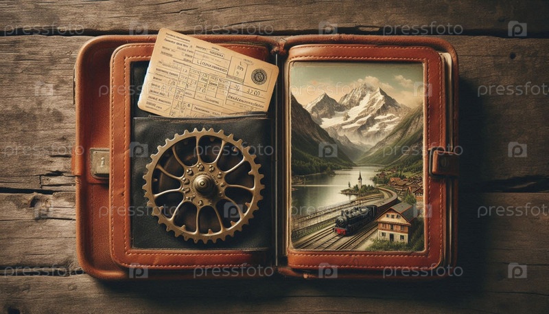 Worn leather postcard album open to reveal vintage Swiss Alps views, Ai generated image (Весенние швейцарские Альпы), созданное изображением Ай