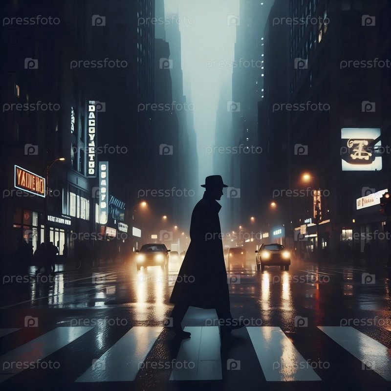Одинокая фигура, пересекающая пролитый дождем перекресток в Нью-Йорке 1970-х годов, Ai generated image