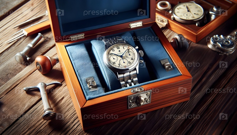 Швейцарские часы в деревянном витрине, изображение создано AI