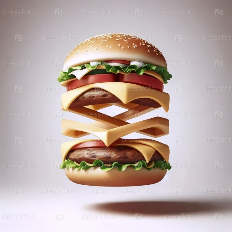Пищевое искусство оптической иллюзии, показывающее невозможную структуру бургера с плавающими элементами, Ai created image