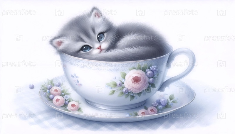 Кавайская сцена кошки в чайной чашке, Ai generated image