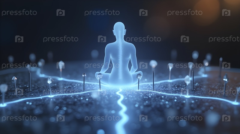 Акупунктурная модель с кристаллическими иглами вдоль меридианных линий, изображение, созданное искусственным интеллектом