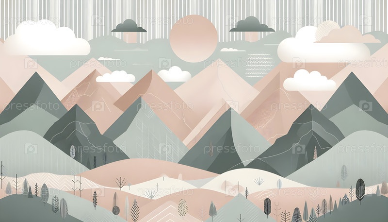 Геометрический горный ландшафт детская комната обои в розовом красном и мятежных цветах, Ai created image