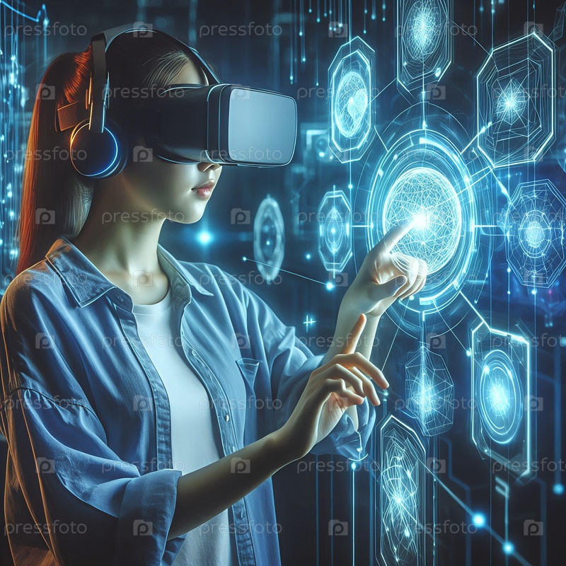 Женщина, которая носит очки VR и прикасается к виртуальным объектам в освещенном неоновым цифровом пространстве с научно-фантастической атмосферой