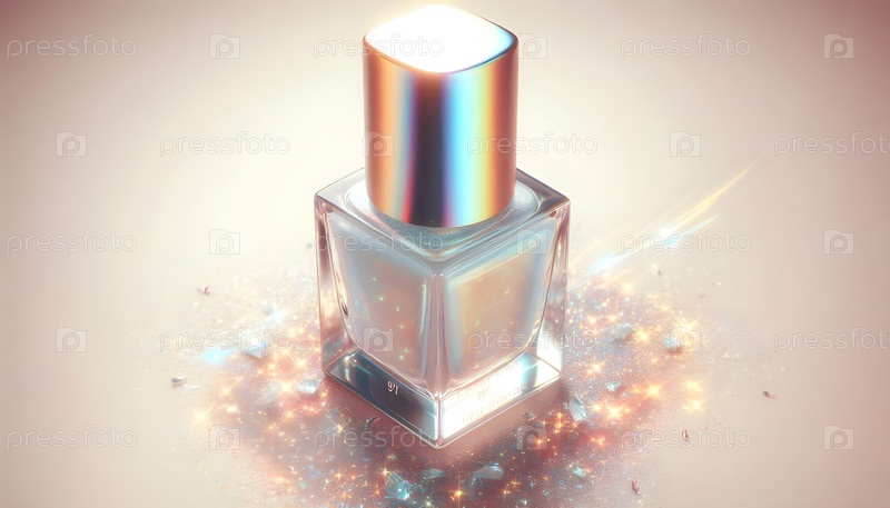 Бутылка с лаком для ногтей, плавающие частицы блеска, image created using Ai