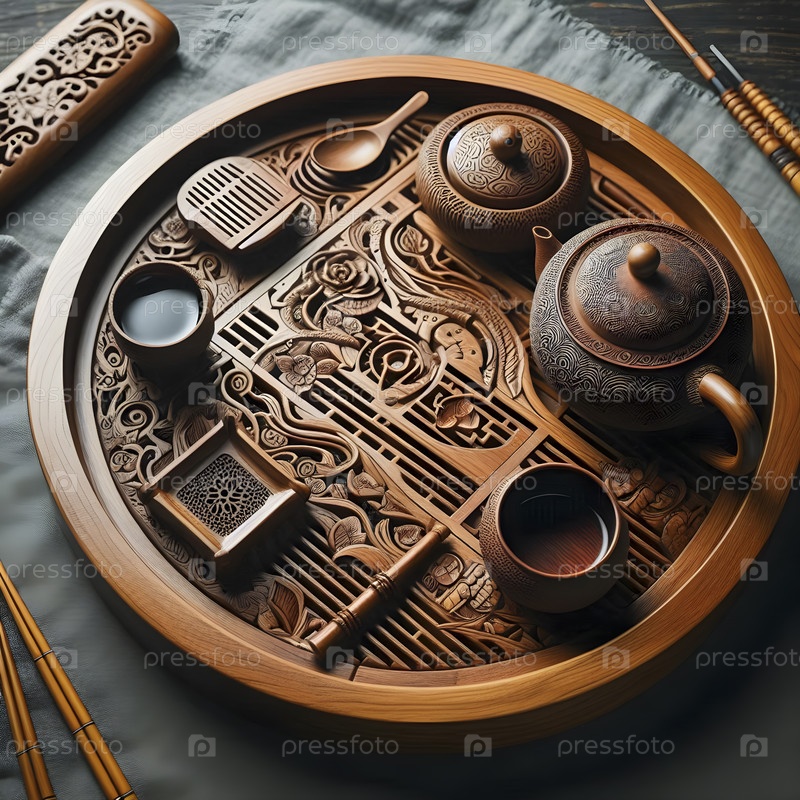 Ручно вырезанный деревянный чайник с сложными каналами дренажа, Ai created image
