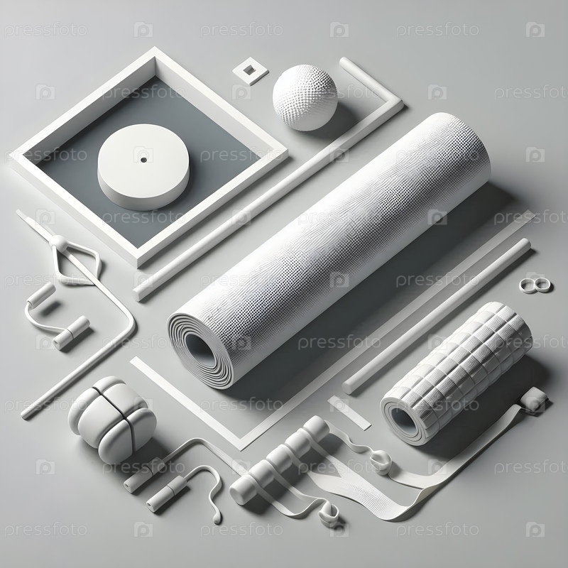 Минималистическое белое спортивное оборудование: резистентные полосы, матрас для йоги и ролик из пены, Ai created image