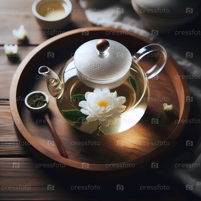 Чайник с цветущим чаем, Ai generated image Glass