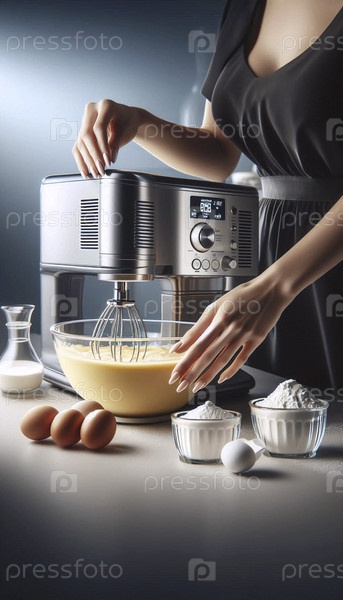 Близкий снимок сверху вниз рук женщины, использующей новый электрический миксер в искрящейся желтой тарелке с ингредиентами, идеально предварительно измеренных в стеклянных чашках