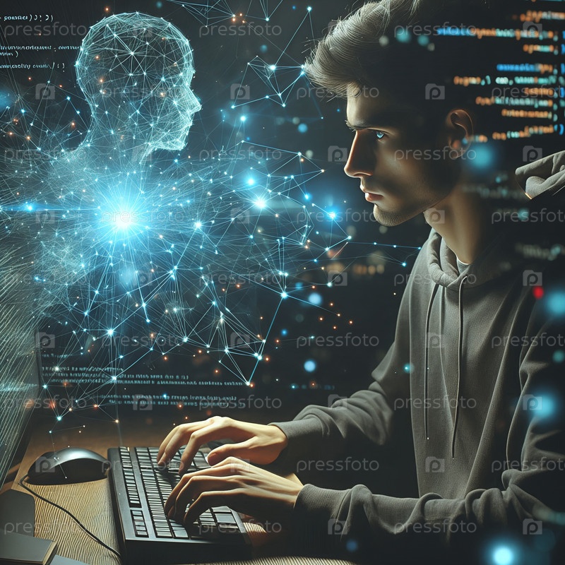 Программист вводит код с светящейся визуализацией нейронной сети на заднем плане, темная тема, цифровое искусство