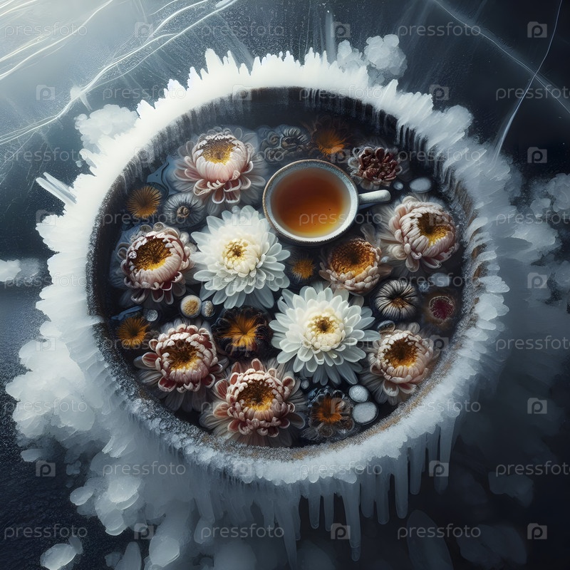 Озеро замороженного чая с встроенными цветами хризантемы, Ai created image