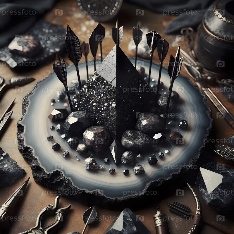 Пирамида шунгита и наконечники стрел обсидиана на резке геоды, Ai created image