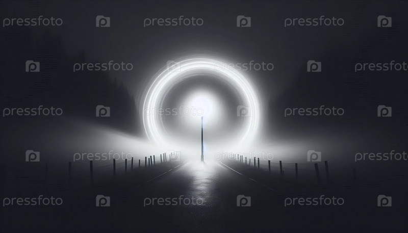 Одинокий уличный фонарь, освещающий вихревое пятно тумана на пустой сельской дороге ночью, Ai generated image