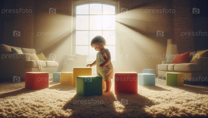Игровая сцена маленького ребенка, играющего с большими цветными блоками алфавита на ковре в солнечной семейной комнате, Ai generated image