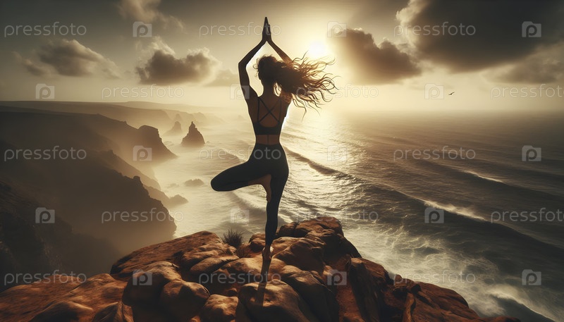 Сзади вид йоги в позе на дереве на краю скалистого обрыва, Ai created image