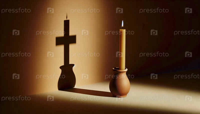 Простая глиняная свеча с деревянной тенью креста, Ai generated image