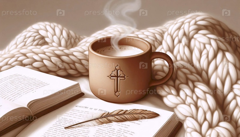 Уютная иллюстрация бохо из кипящей чаши на вязанном одеяле, Ai generated image