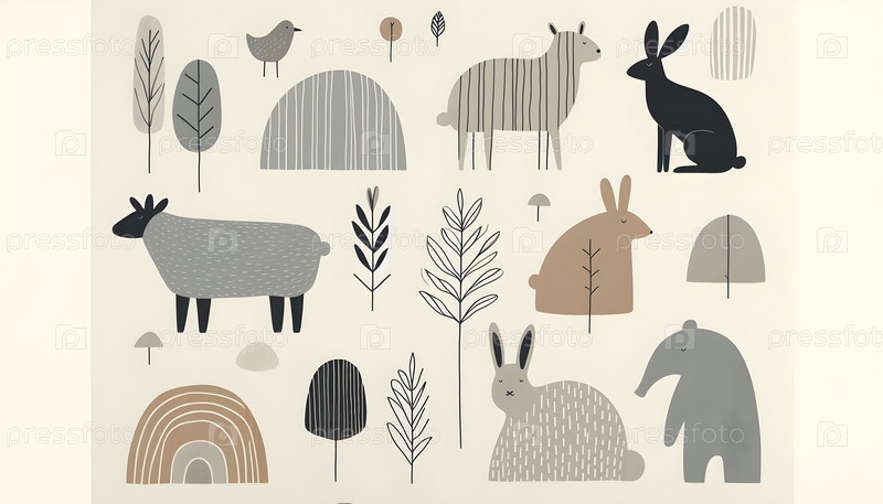 Скандинавские минималистические силуэты животных детская комната обои, Ai created image