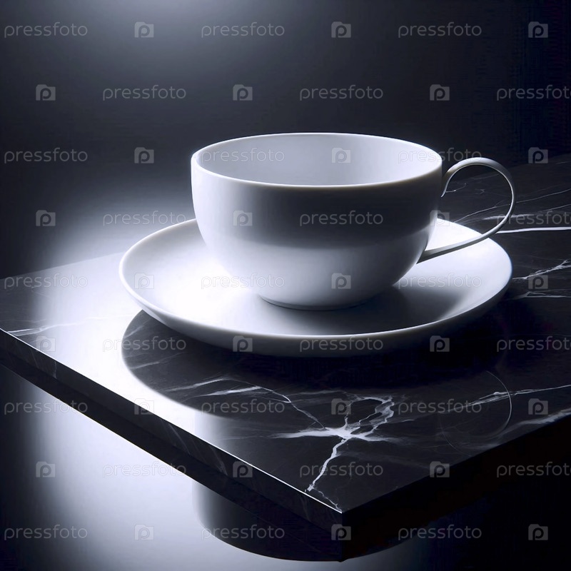 Продуктовый снимок минималистической фарфоровой чайной чашки на поверхности черного мрамора, сосредоточьтесь на идеальном обочине и ручке, Ai generated image