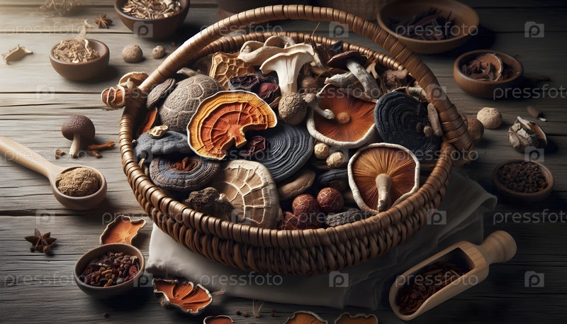 Ручная корзина, наполненная сушеными лекарственными грибами, Ai created image