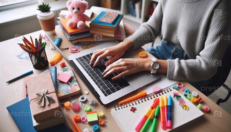 Руки, печатающие на клавиатуре в творческой атмосфере рабочего пространства, Ai generated image