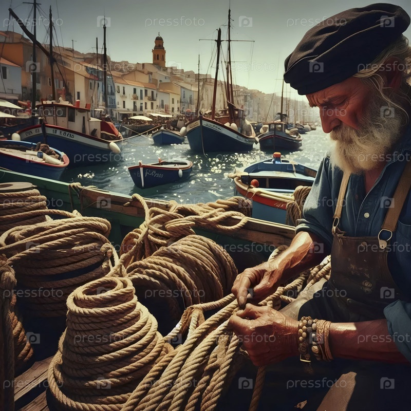 Старый матрос, исправляющий рыболовные сети на ветреной деревянной палубе своей лодки в оживленной средиземноморской гавани, Ай создал изображение