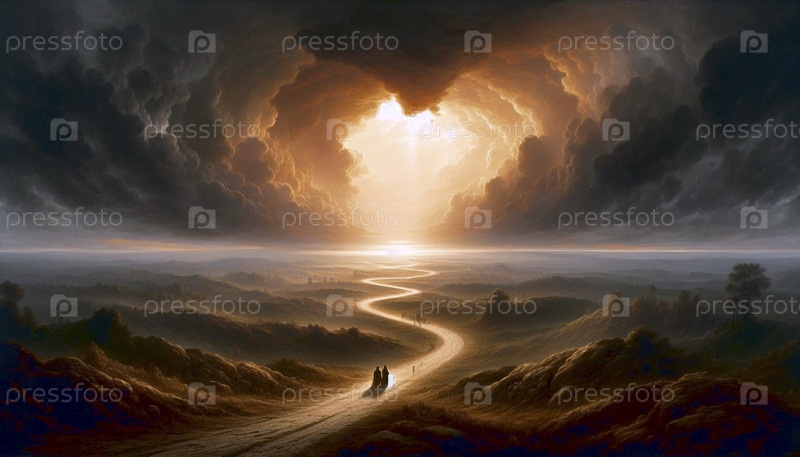 Дорога в Эммаус на закате, романтическая живопись, Ai generated image