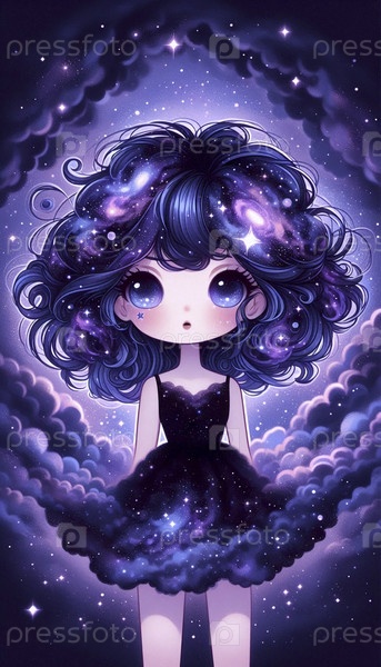 Подробная иллюстрация девушки-кавайи, которая является живым ночным небом, Ai generated image