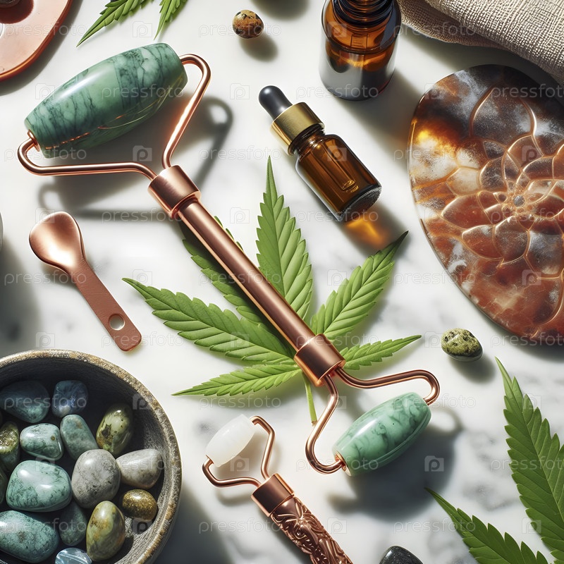 Аэрофотосъемка инструментов восстановления: медный гуа-ша, ролик из нефрита и капли CBD масла, Ai created image