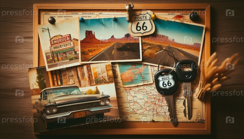 Солнечные американские придорожные открытки, прикрепленные к корковым доскам, Ai generated image