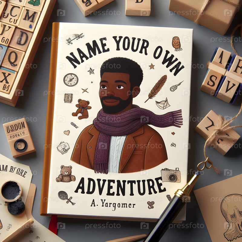 Custom Name Your Own Adventure детская книга, размещенная рядом с алфавитными марками и чернилами, Ai created image