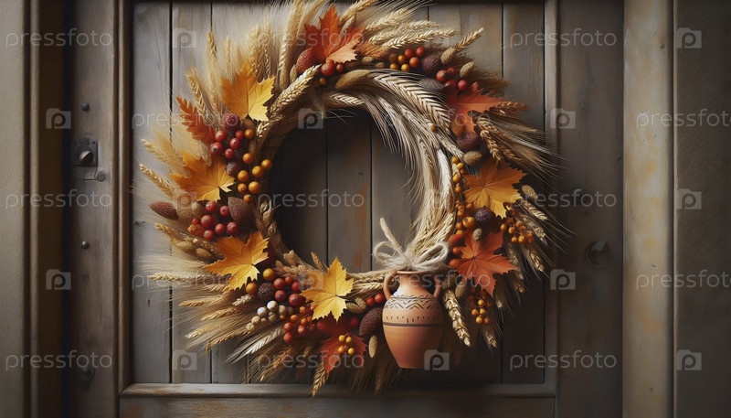 Венок из пшеницы и осенних листьев с миниатюрным глиняным кувшином, Ai generated image