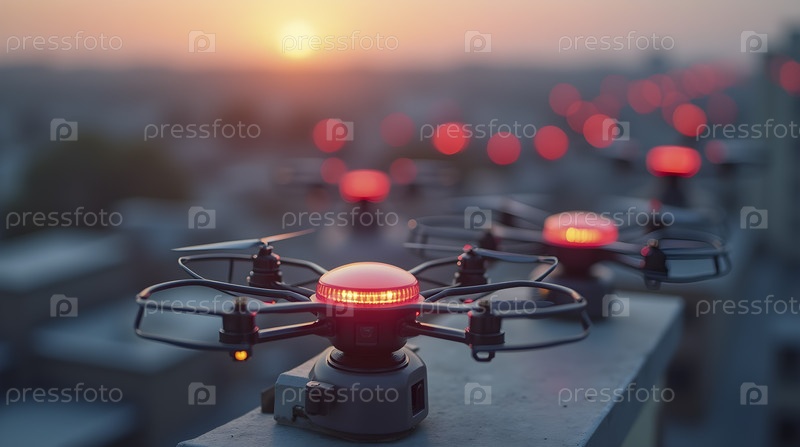 Аварийные порты беспилотных летательных аппаратов на крышах пульсируют в красный цвет, изображение создано искусственным интеллектом