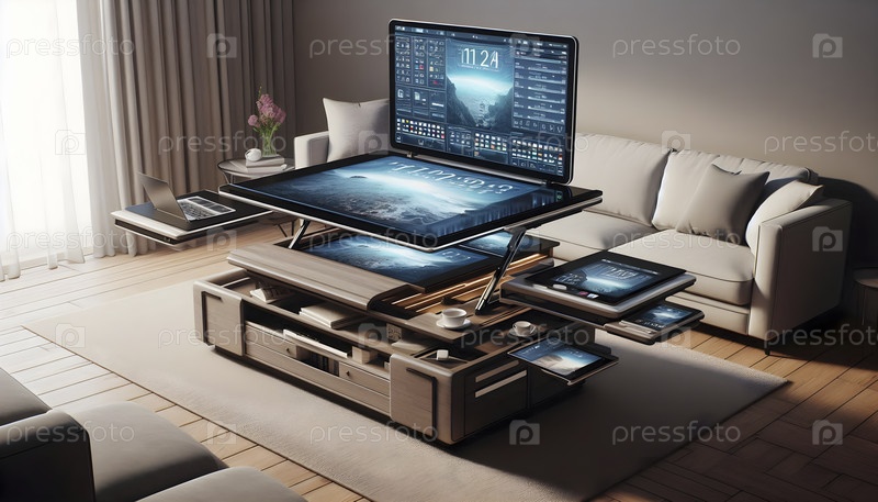 Кофейный стол превращается в рабочую станцию, Ai created image