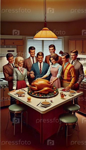 Семья собралась в современной кухне, все улыбаются, когда мать представляет идеально жареную индейку на серебряном блюде, Ai generated image