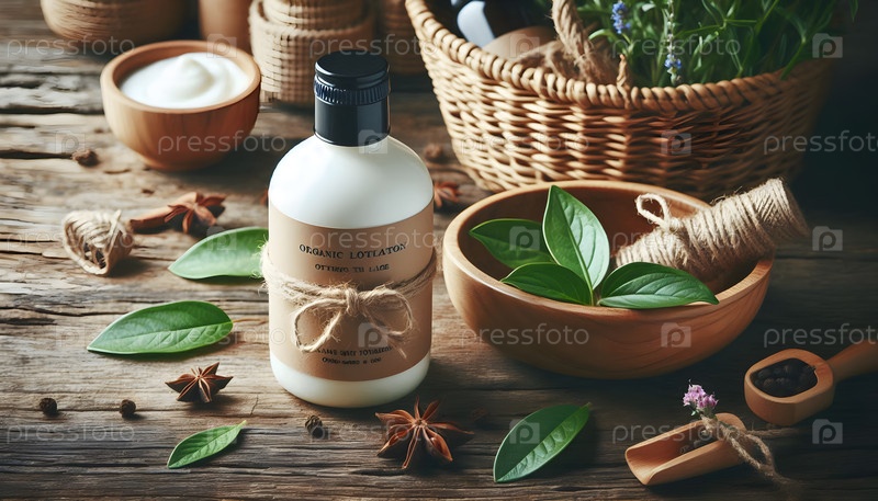 Бутылка лосьона, деревенский стол, изображение создано с использованием Ai