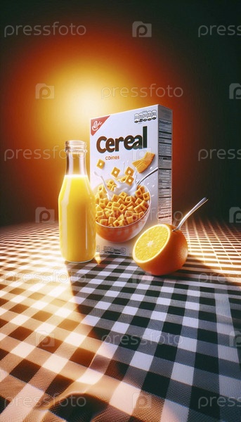 Высоко стилизованный набор завтракового стола с коробкой хлопьев, бокалом апельсинового сока и бутылкой молока, идеально расположенных на квадратной ткани, Ai создал изображение