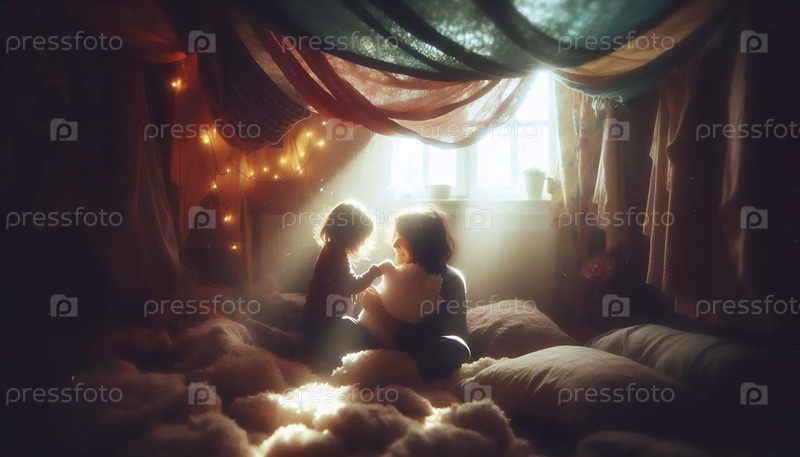 Семья, строящая разветвленную и сложную ковровую крепость в гостиной, захваченная изнутри форта, создала образ Ай